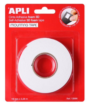 Ragasztó tekercs, 3D, kétoldalas, szivacs, APLI, 19 mm x 2,28 m, fehér